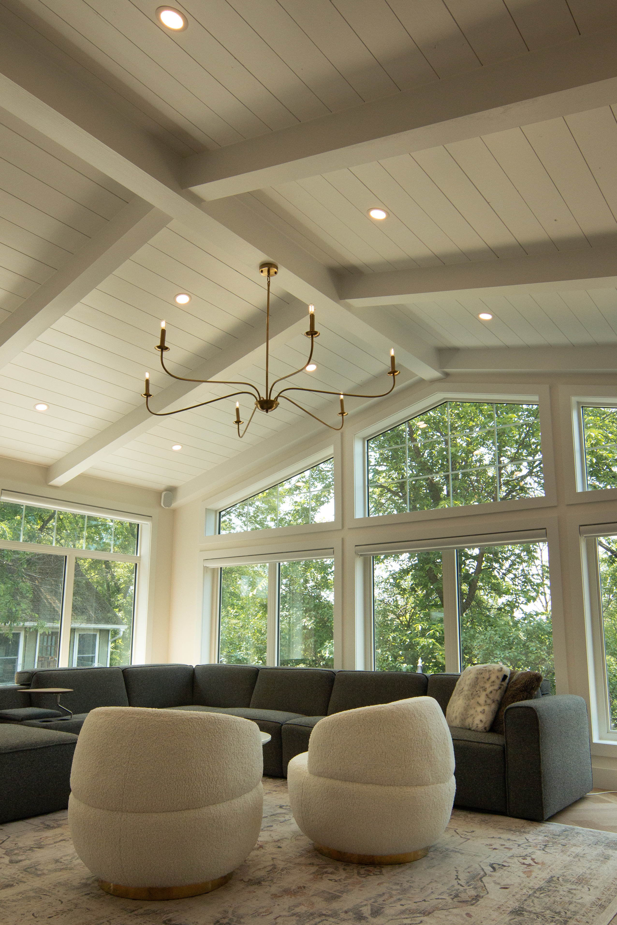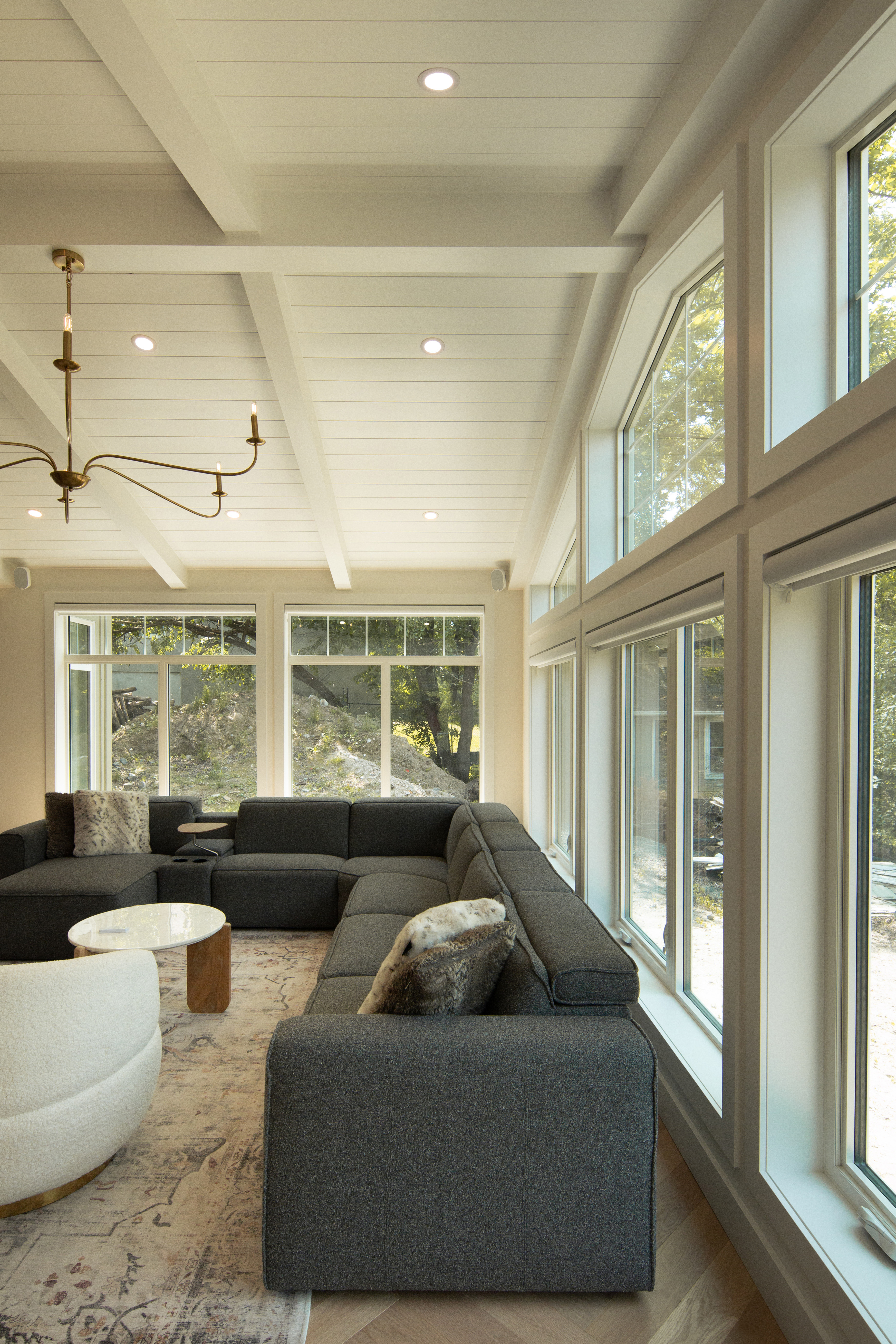 This sunroom was designed to enhance the clients’ living space and accommodate their expanding family. The clean lines and contemporary materials complement the recently renovated home. The expansive glass panels flood the interior with ample natural light.